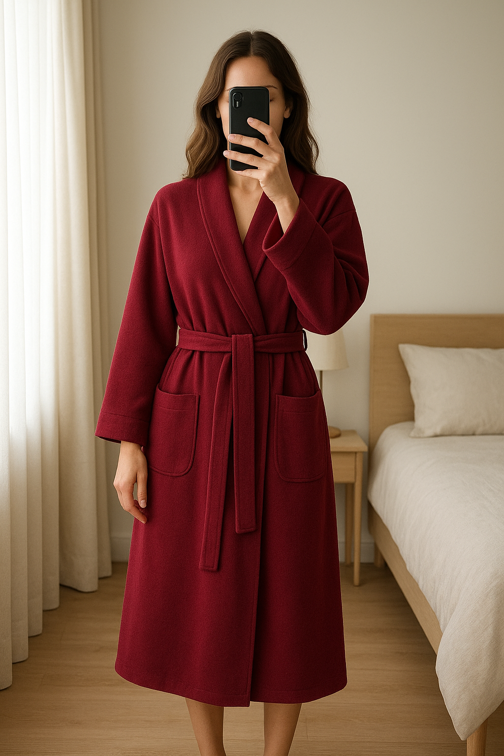 manteau beige long en laine debout, face à la caméra, dans une chambre à la lumière douce, avec une lumière naturelle filtrant par la fenêtre.