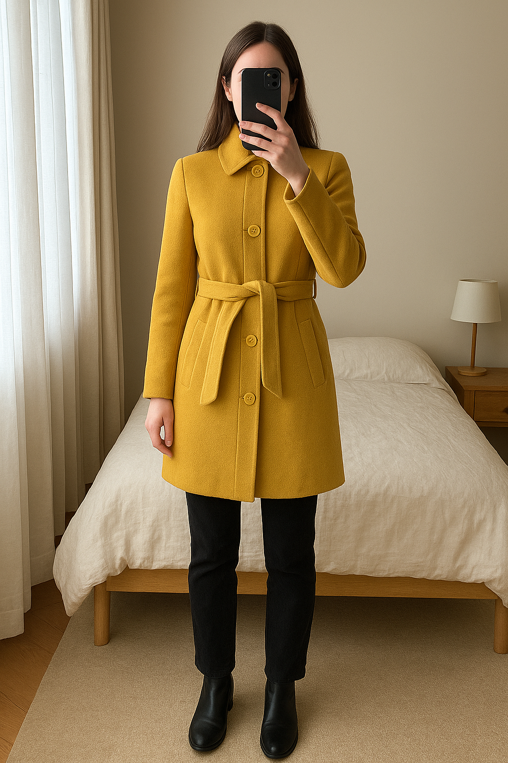 Manteau camaïeu jaune debout, face à la caméra, dans une chambre à la lumière douce, avec une lumière naturelle filtrant par la fenêtre.
