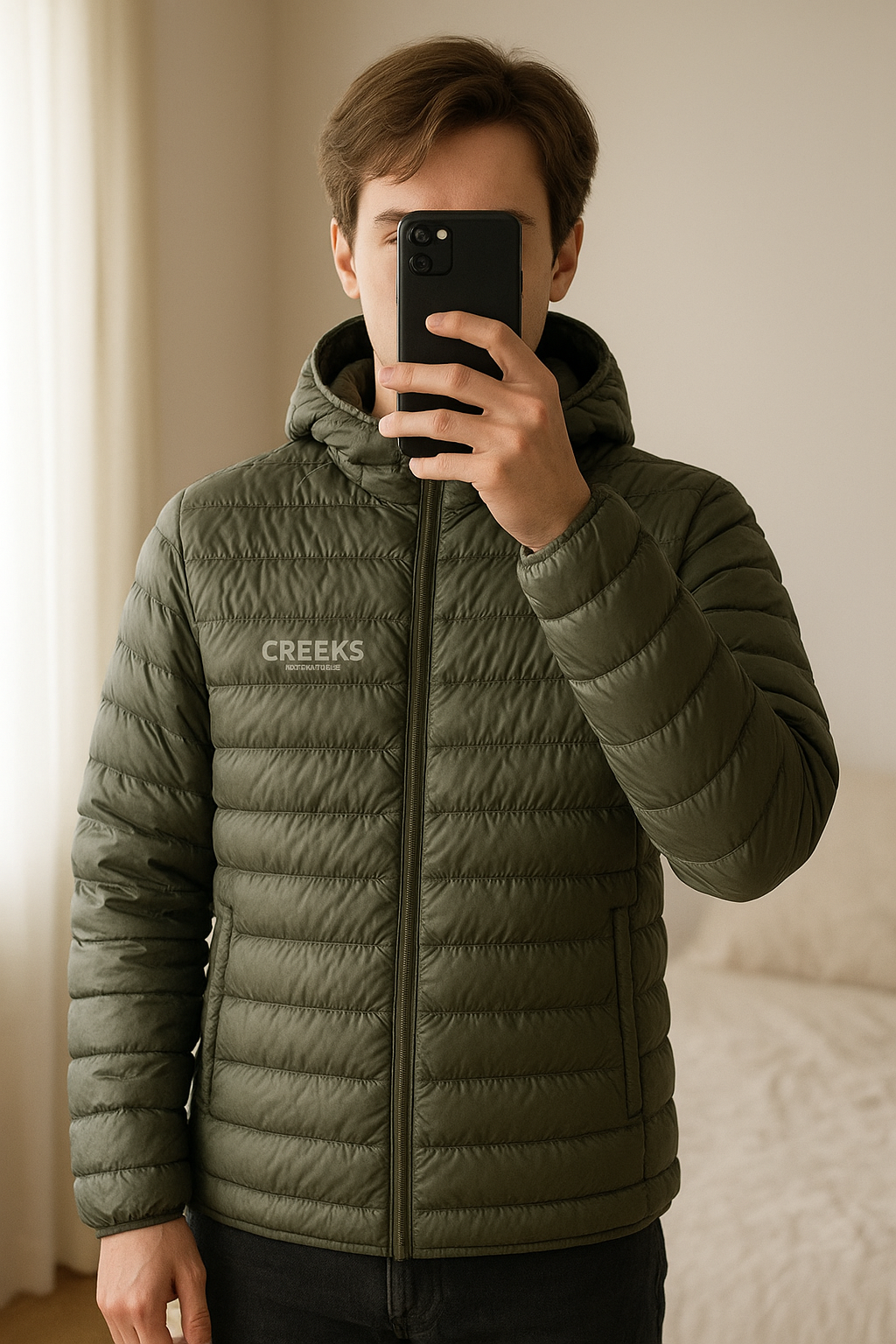 Manteau Creeks debout, face à la caméra, dans une chambre à la lumière douce, avec une lumière naturelle filtrant par la fenêtre.