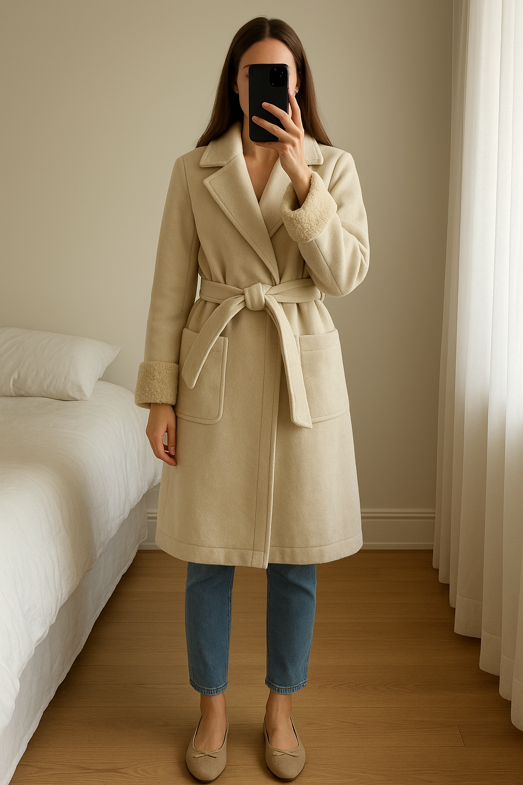 Manteau d’hiver beige debout, face à la caméra, dans une chambre à la lumière douce, avec une lumière naturelle filtrant par la fenêtre.