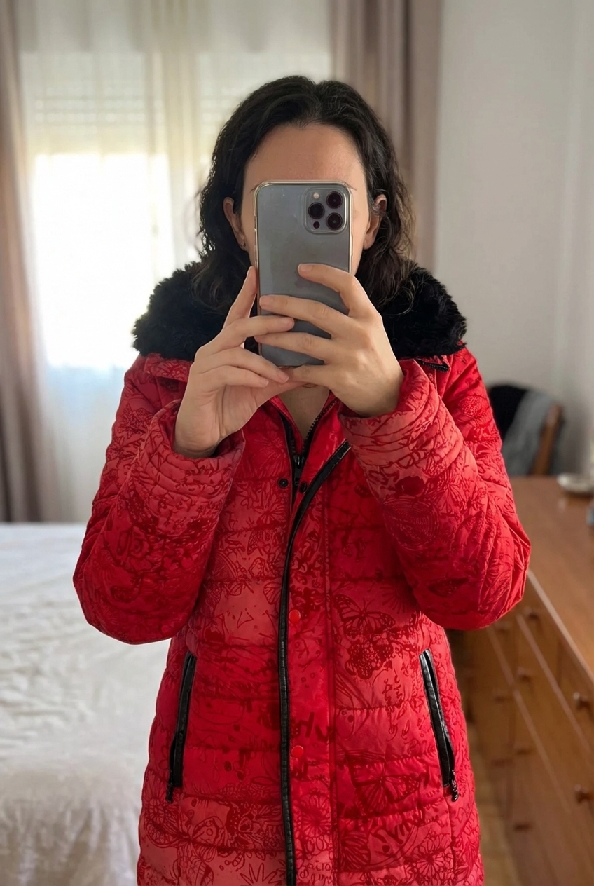 Manteau Desigual debout, face à la caméra, dans une chambre à la lumière douce, avec une lumière naturelle filtrant par la fenêtre.