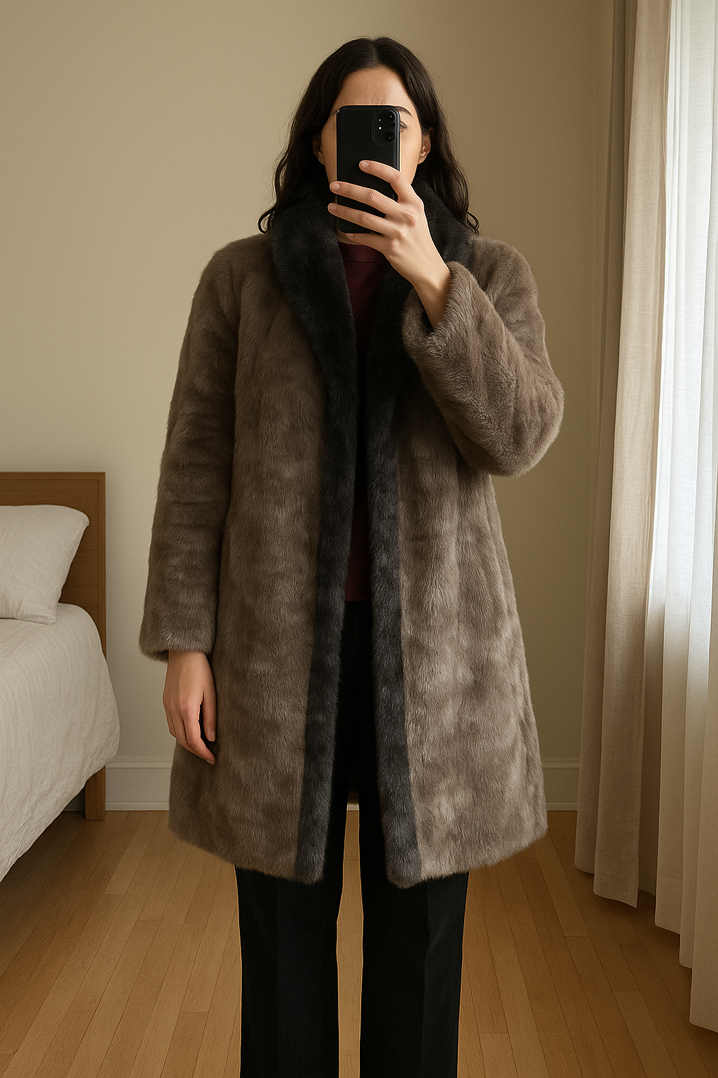 🌹Manteau fausse fourrure Printemps debout, face à la caméra, dans une chambre à la lumière douce, avec une lumière naturelle filtrant par la fenêtre.