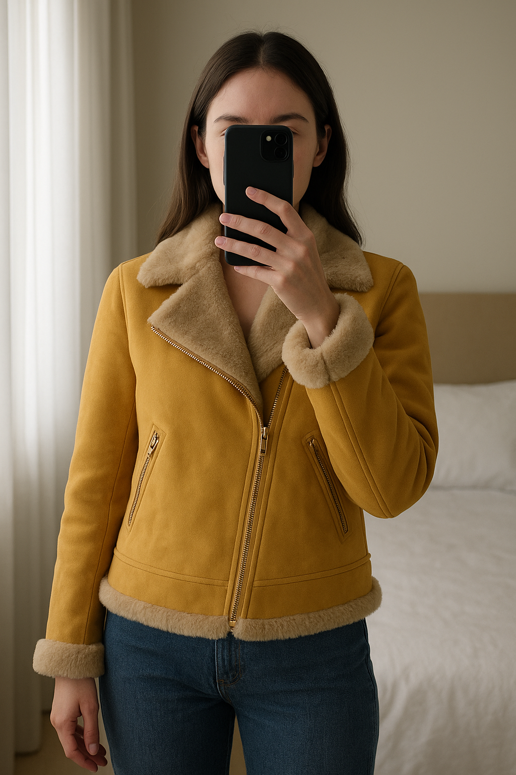 Manteau femme debout, face à la caméra, dans une chambre à la lumière douce, avec une lumière naturelle filtrant par la fenêtre.