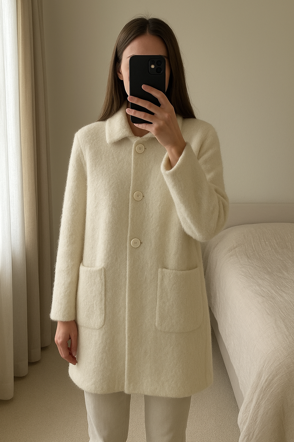 Manteau femme Burton debout, face à la caméra, dans une chambre à la lumière douce, avec une lumière naturelle filtrant par la fenêtre.
