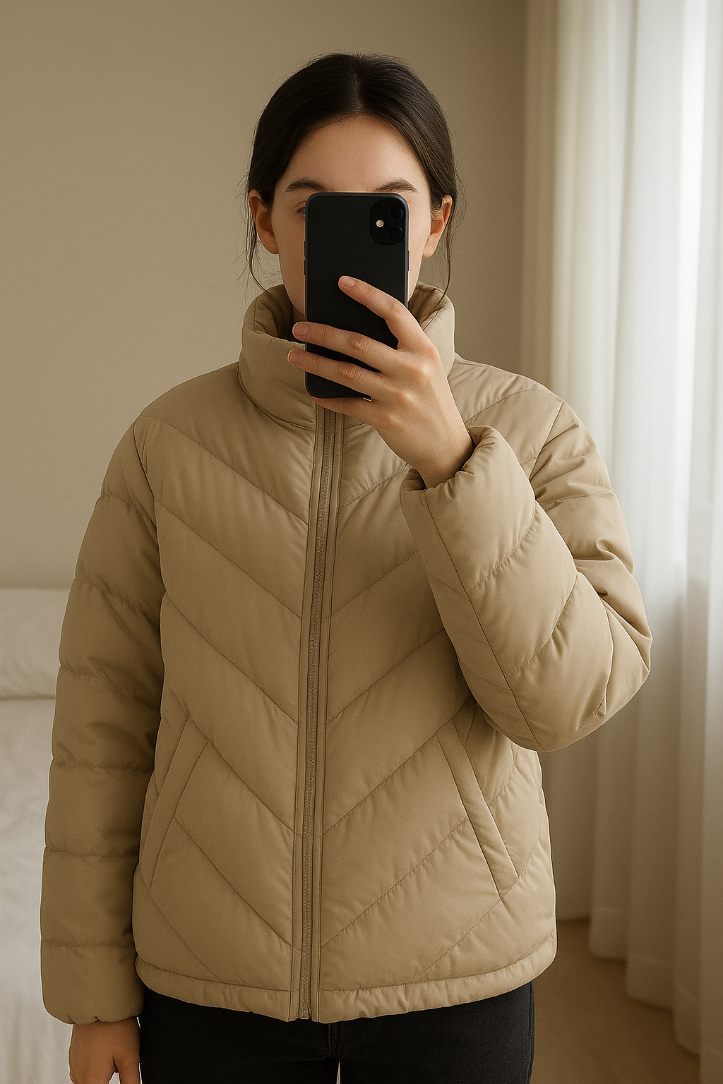 Manteau hivers chaud L debout, face à la caméra, dans une chambre à la lumière douce, avec une lumière naturelle filtrant par la fenêtre.