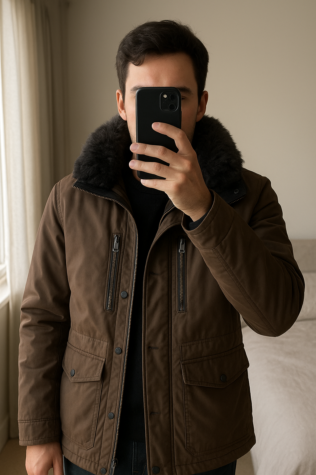Manteau IKKS debout, face à la caméra, dans une chambre à la lumière douce, avec une lumière naturelle filtrant par la fenêtre.