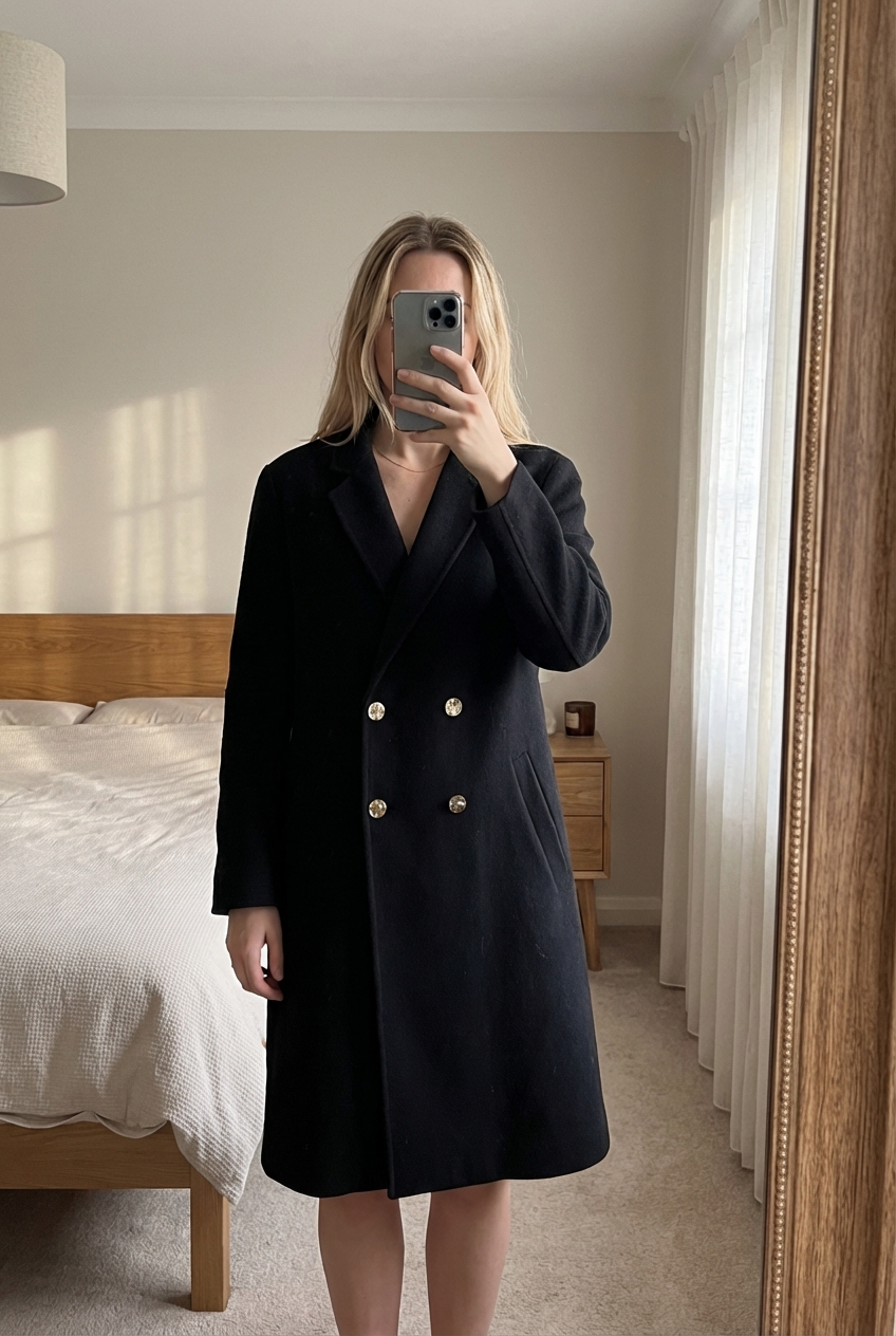 Manteau long draps de laine, taille 38 debout, face à la caméra, dans une chambre à la lumière douce, avec une lumière naturelle filtrant par la fenêtre.