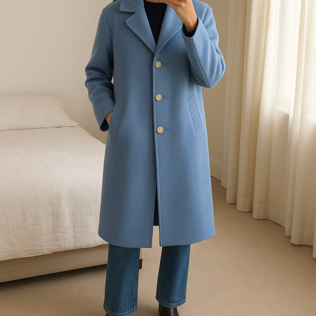 Manteau long MONGO bleu clair en laine – boutons dorés, look chic parisien intemporel 💙 debout, face à la caméra, dans une chambre à la lumière douce, avec une lumière naturelle filtrant par la fenêtre.