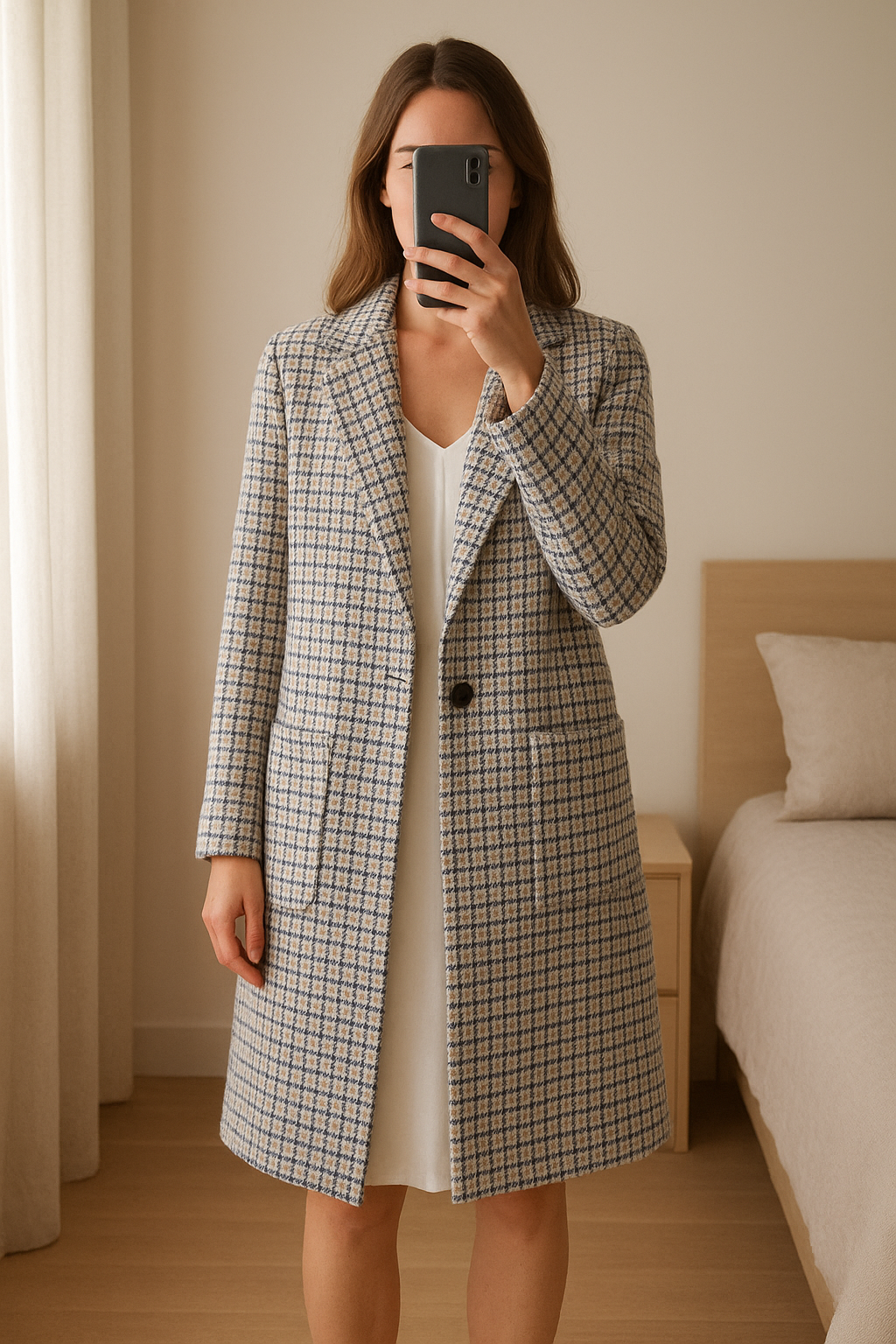 Manteau Max Mila Paris debout, face à la caméra, dans une chambre à la lumière douce, avec une lumière naturelle filtrant par la fenêtre.