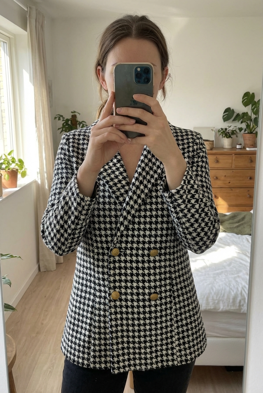 Manteau motif design debout, face à la caméra, dans une chambre à la lumière douce, avec une lumière naturelle filtrant par la fenêtre.