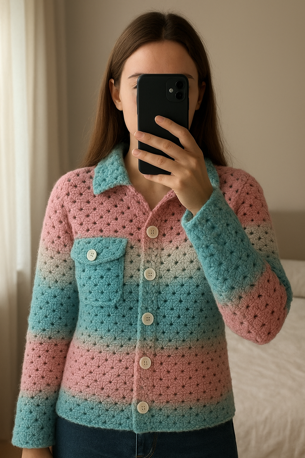 Manteau, rose et bleu. Taille 42. Bon état. debout, face à la caméra, dans une chambre à la lumière douce, avec une lumière naturelle filtrant par la fenêtre.