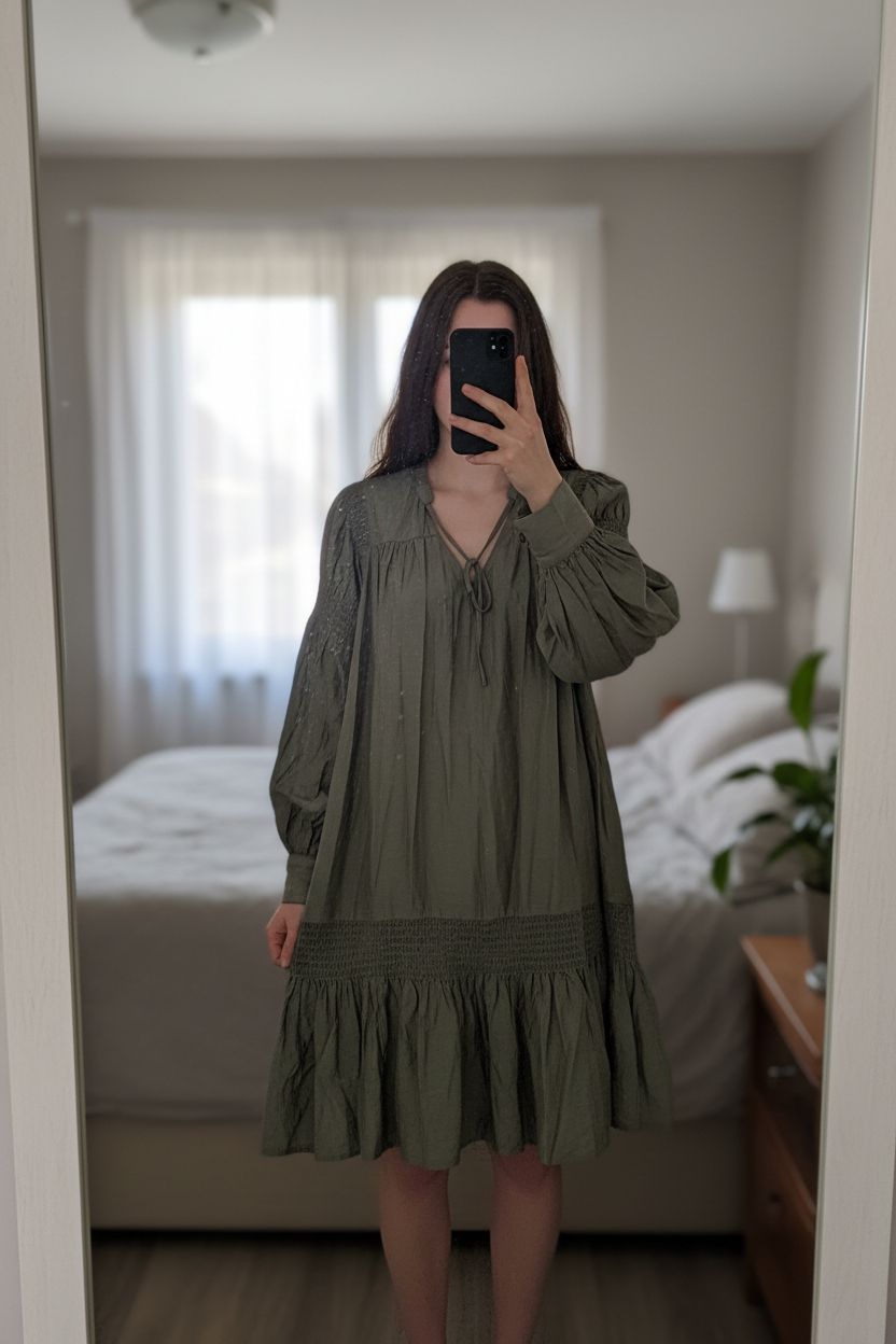 Midi suknelė standing straight facing the camera, in a softly lit bedroom setting, with gentle natural light filtering through a window.