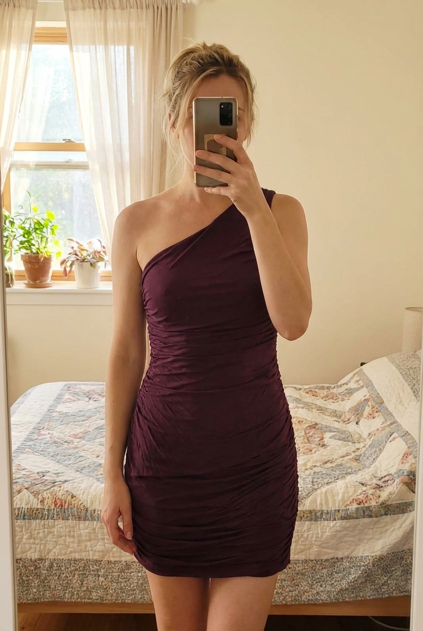 Mini vestido de fiesta ajustado de pie, mirando a la cámara, en un dormitorio con luz suave y natural filtrándose por la ventana.