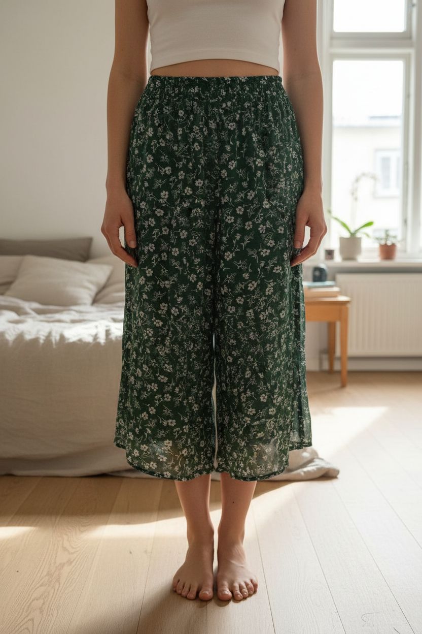 Minifalda brownie de pie, mirando a la cámara, en un dormitorio con luz suave y natural filtrándose por la ventana.