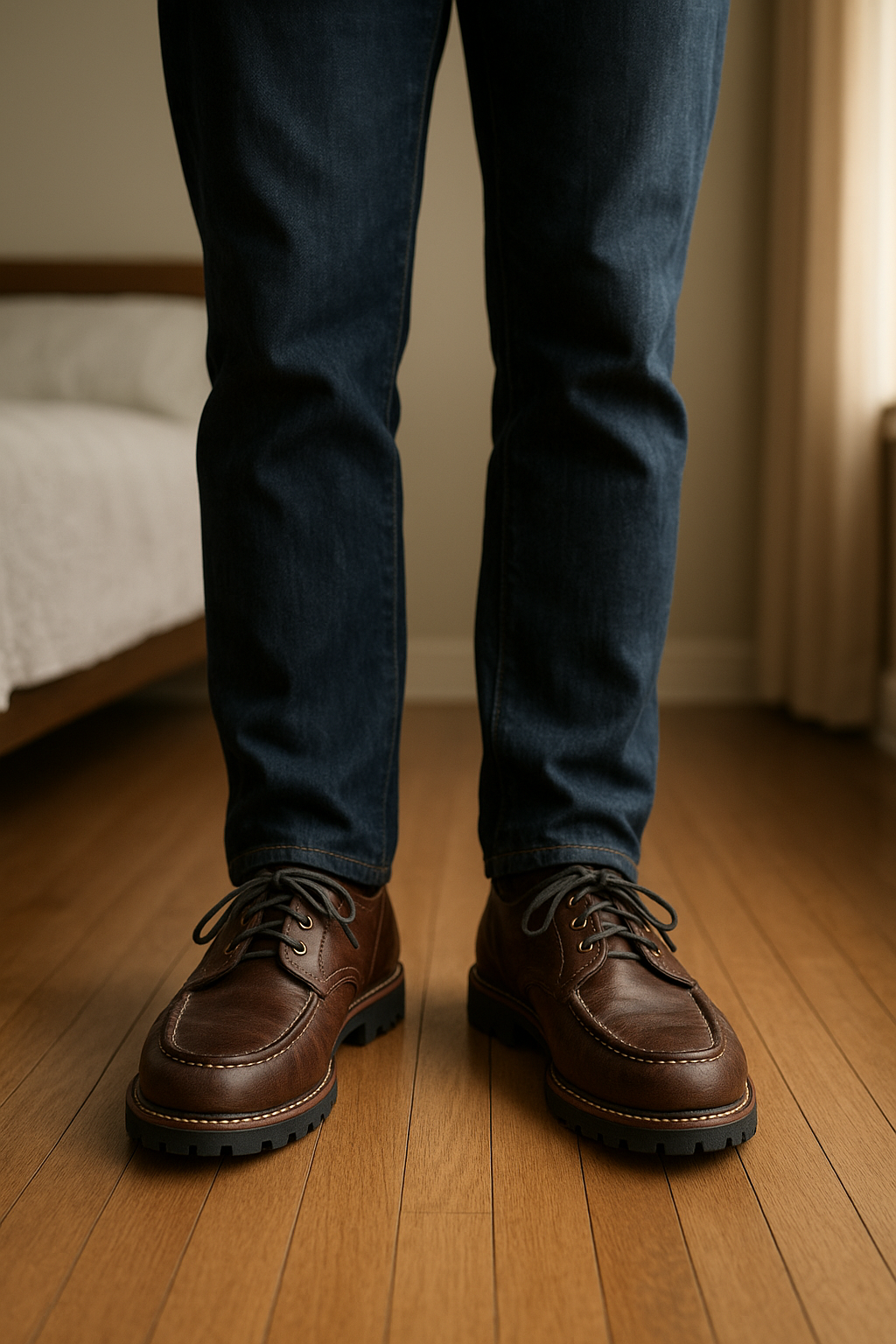 Mocassins En Cuir Paraboots T40 debout, face à la caméra, dans une chambre à la lumière douce, avec une lumière naturelle filtrant par la fenêtre.