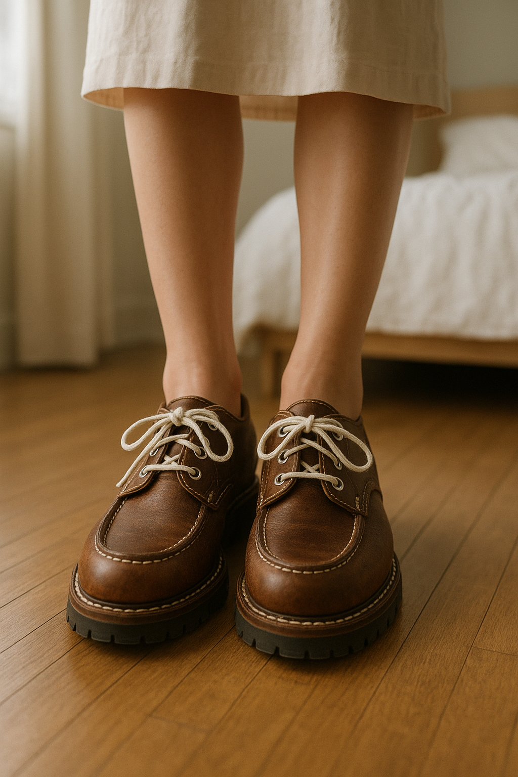 Mocassins Sebago Dockside T40 debout, face à la caméra, dans une chambre à la lumière douce, avec une lumière naturelle filtrant par la fenêtre.