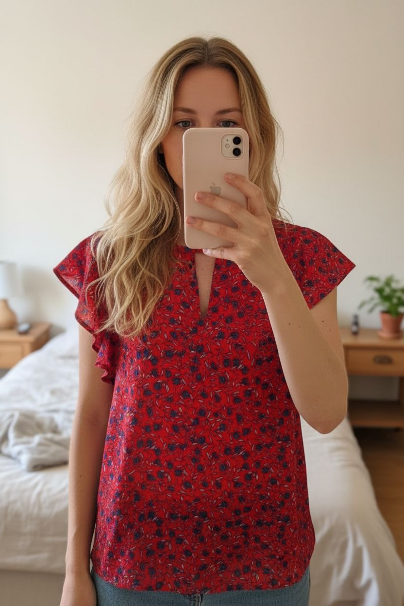 Monoprix top pour l'été taille 40 debout, face à la caméra, dans une chambre à la lumière douce, avec une lumière naturelle filtrant par la fenêtre.