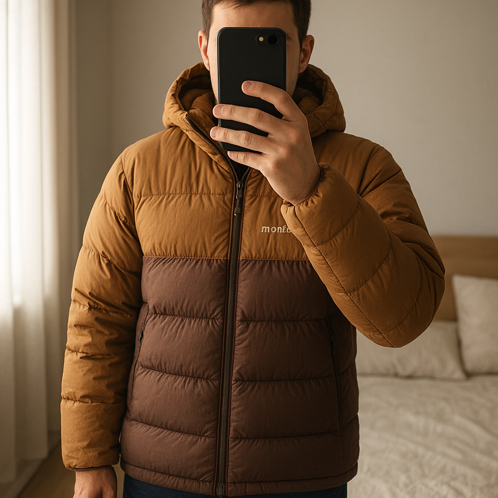 Montbell Doudoune puffer Homme Taille M – Marron, Très Chaude – Très Bon État debout, face à la caméra, dans une chambre à la lumière douce, avec une lumière naturelle filtrant par la fenêtre.