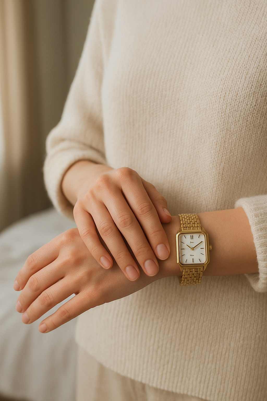 Montre luxueuse debout, face à la caméra, dans une chambre à la lumière douce, avec une lumière naturelle filtrant par la fenêtre.