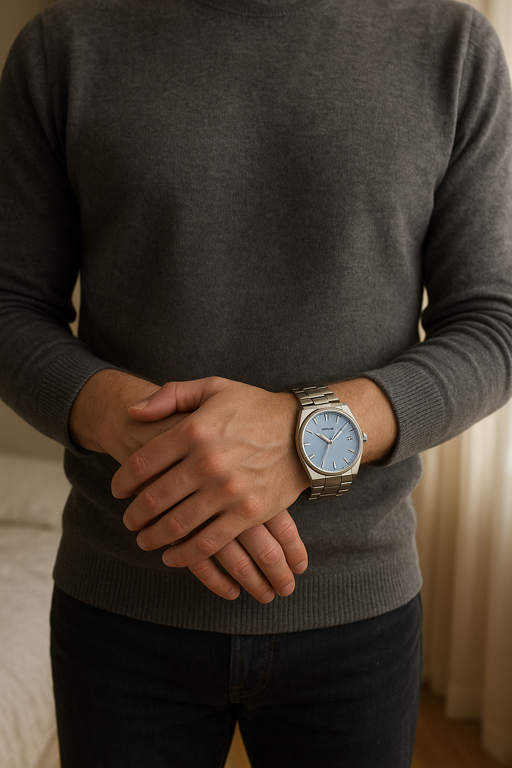 Montre Tissot neuve jamais porté debout, face à la caméra, dans une chambre à la lumière douce, avec une lumière naturelle filtrant par la fenêtre.