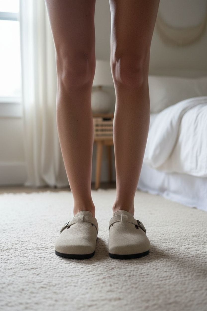 Mules taupe beige style Birkenstock debout, face à la caméra, dans une chambre à la lumière douce, avec une lumière naturelle filtrant par la fenêtre.