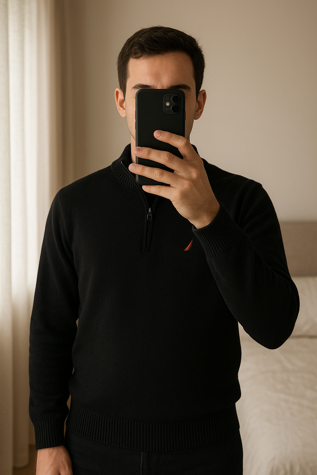 Nautica standing straight facing the camera, in a softly lit bedroom setting, with gentle natural light filtering through a window.