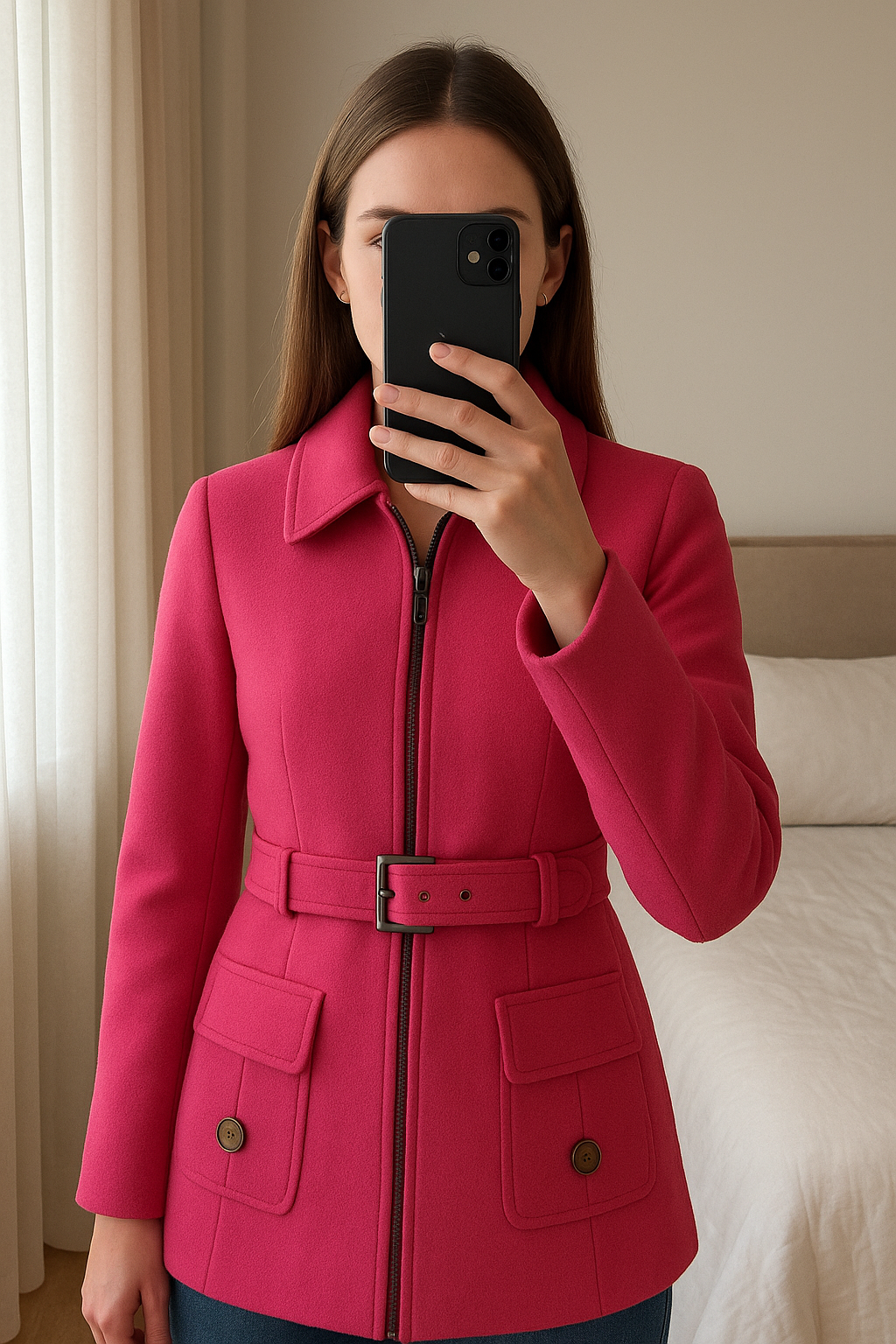 Nieuwe roze jas - Marks & Spencer - Maat 38 debout, face à la caméra, dans une chambre à la lumière douce, avec une lumière naturelle filtrant par la fenêtre.