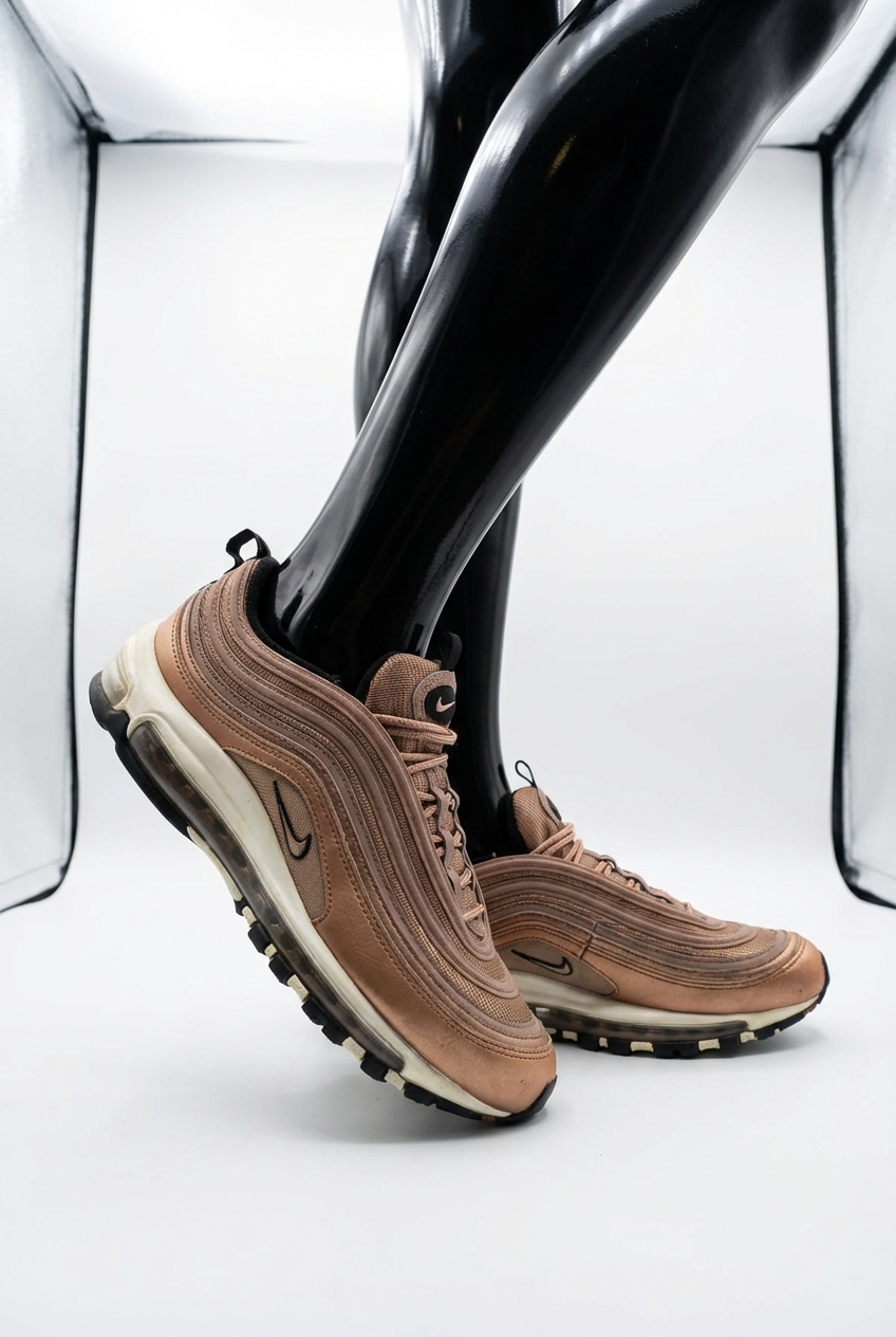 a glossy black plastic mannequin with no facial features in Nike Air Max Bronze Trainers Size 7.5 arching their back slightly for a dynamic pose, in a clean photo studio with seamless white backdrop and softbox lighting.