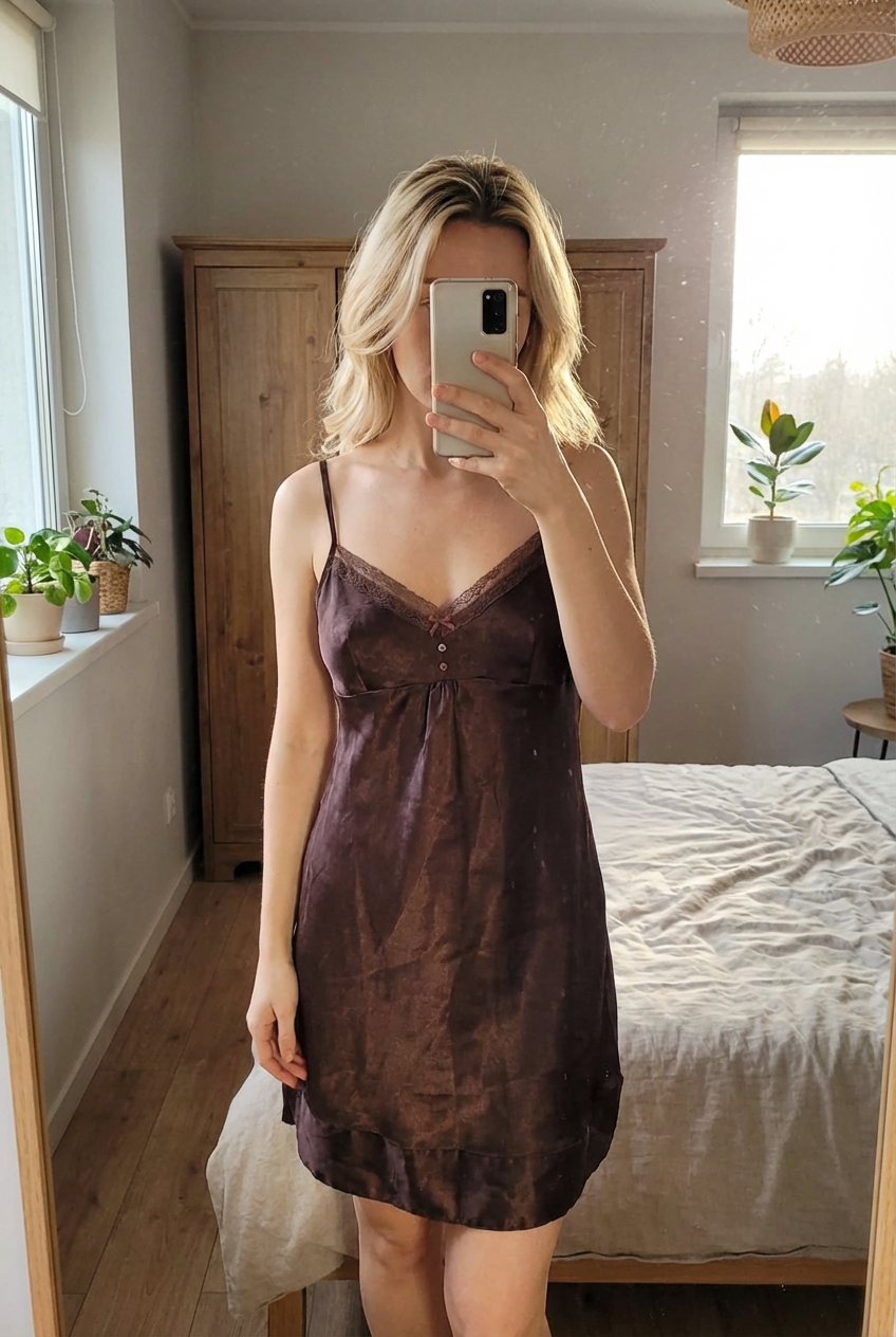 Nuisette effet satin debout, face à la caméra, dans une chambre à la lumière douce, avec une lumière naturelle filtrant par la fenêtre.