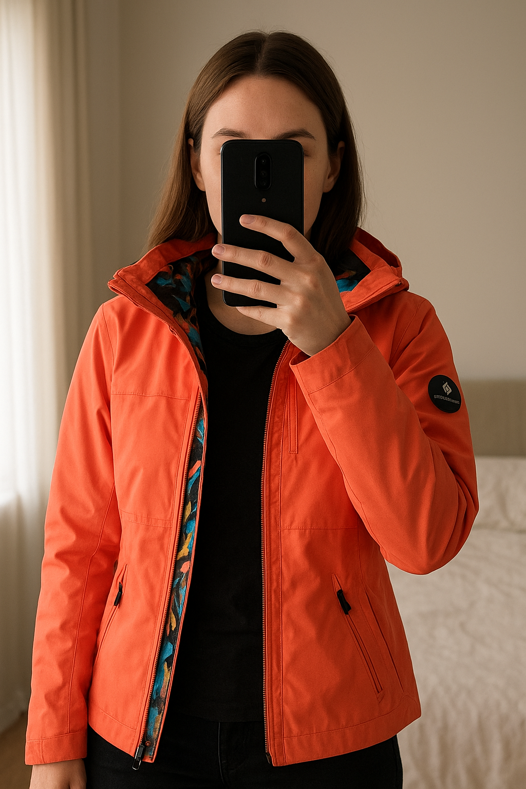 Obermeyer - manteau veste haut de gamme ski sport d'hiver fille 10-12 ans neuf debout, face à la caméra, dans une chambre à la lumière douce, avec une lumière naturelle filtrant par la fenêtre.