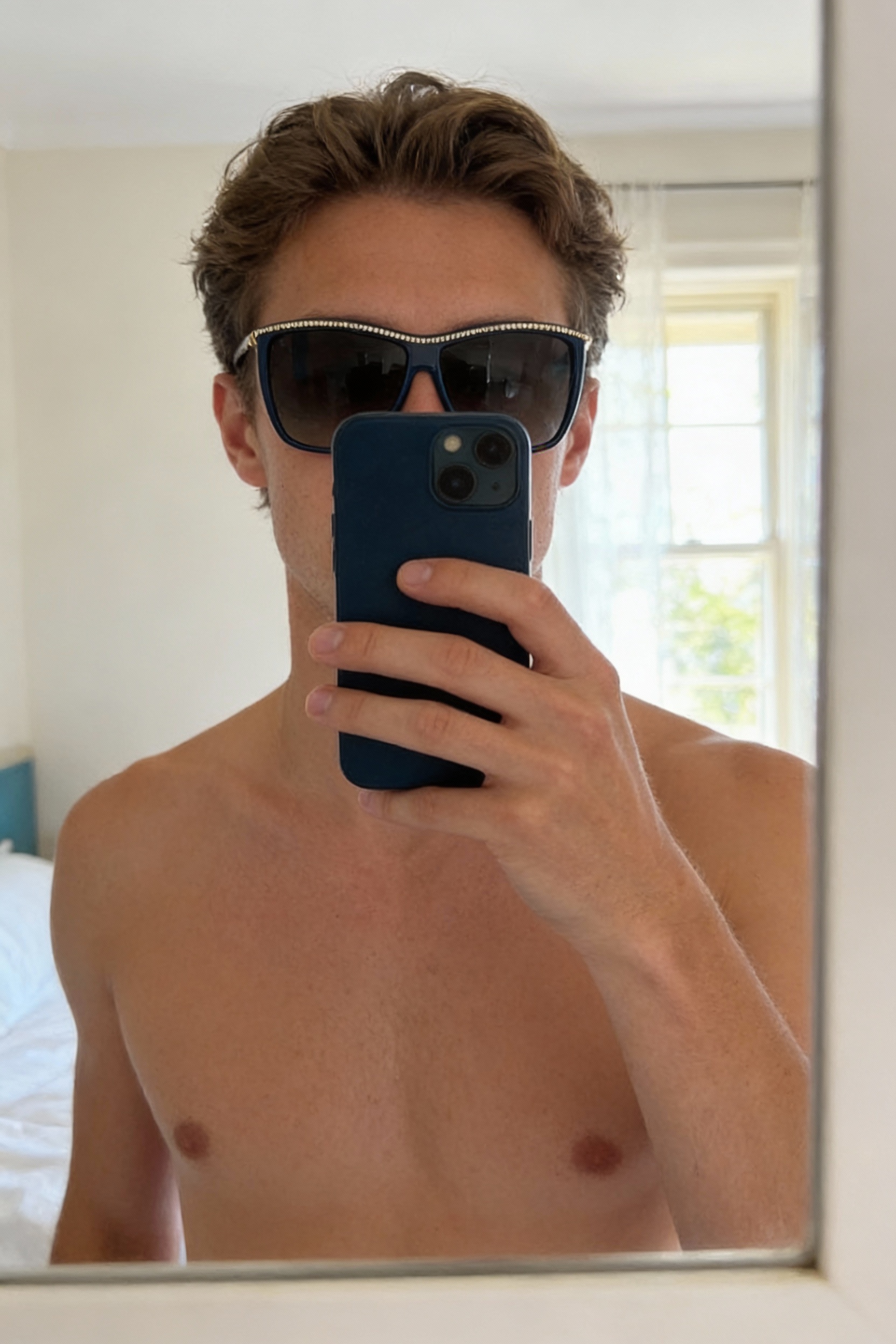 Paire de lunettes Chloé debout, face à la caméra, dans une chambre à la lumière douce, avec une lumière naturelle filtrant par la fenêtre.