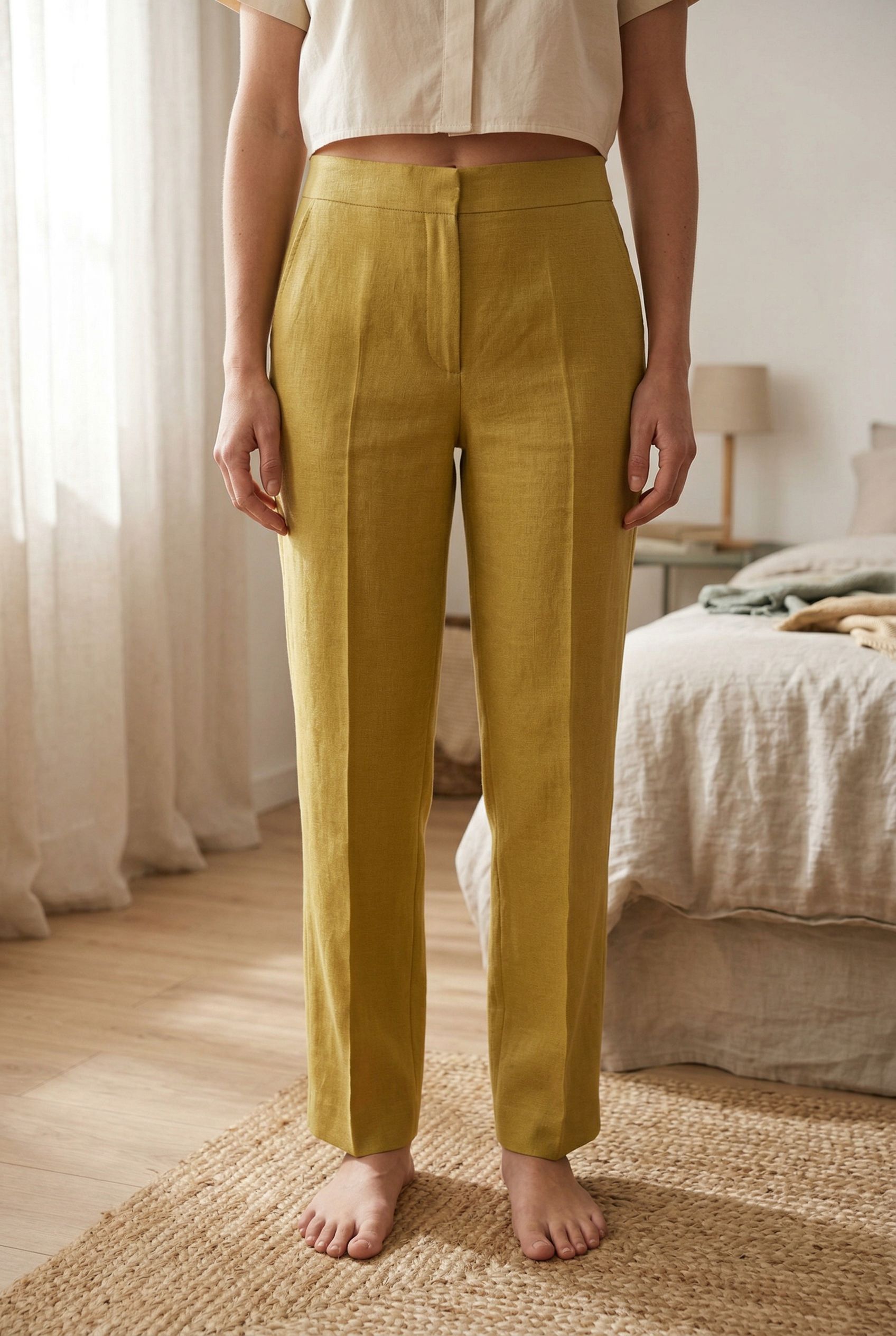 Pantalón Episode. Talla 36 perfecto estado 💚 de pie, mirando a la cámara, en un dormitorio con luz suave y natural filtrándose por la ventana.
