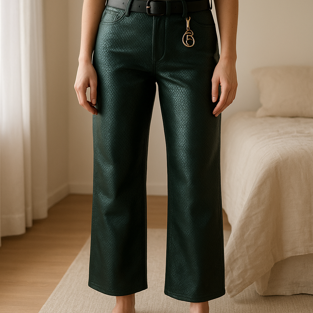Una persona con Pantalón piel sintética de pie, mirando a la cámara, en un dormitorio con luz suave y natural filtrándose por la ventana.