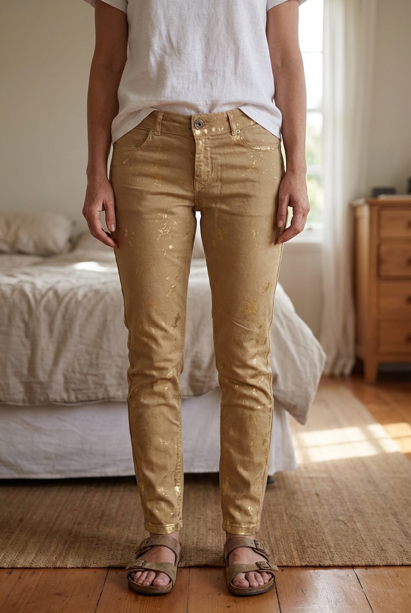 Pantalón vaquero Hoss Intropia de pie, mirando a la cámara, en un dormitorio con luz suave y natural filtrándose por la ventana.