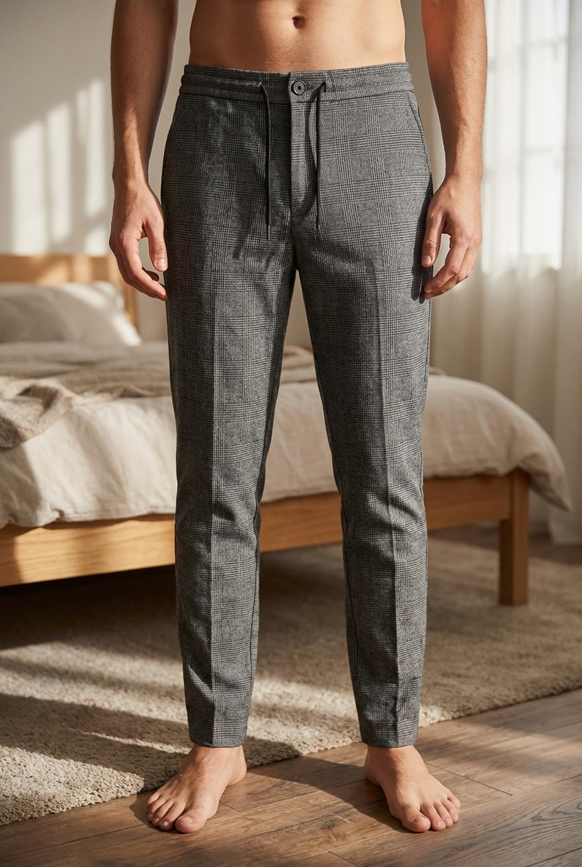 Une personne en Pantalon debout, face à la caméra, dans une chambre à la lumière douce, avec une lumière naturelle filtrant par la fenêtre.