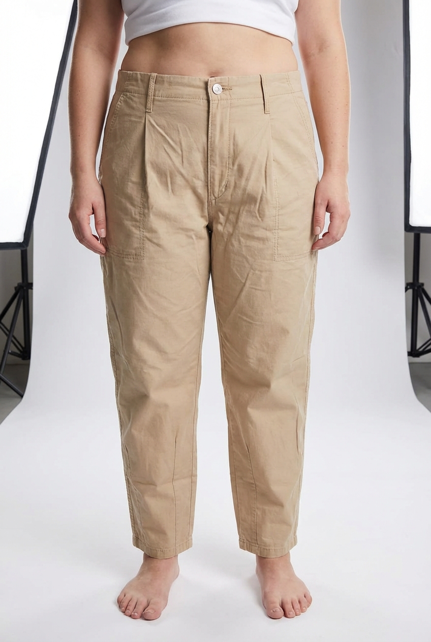 Une personne en Pantalon 3/4 beige Levi’s en 100% coton - Taille 36 debout, face à la caméra, avec une silhouette légèrement plus ronde, dans un studio photo épuré avec fond blanc et éclairage doux.