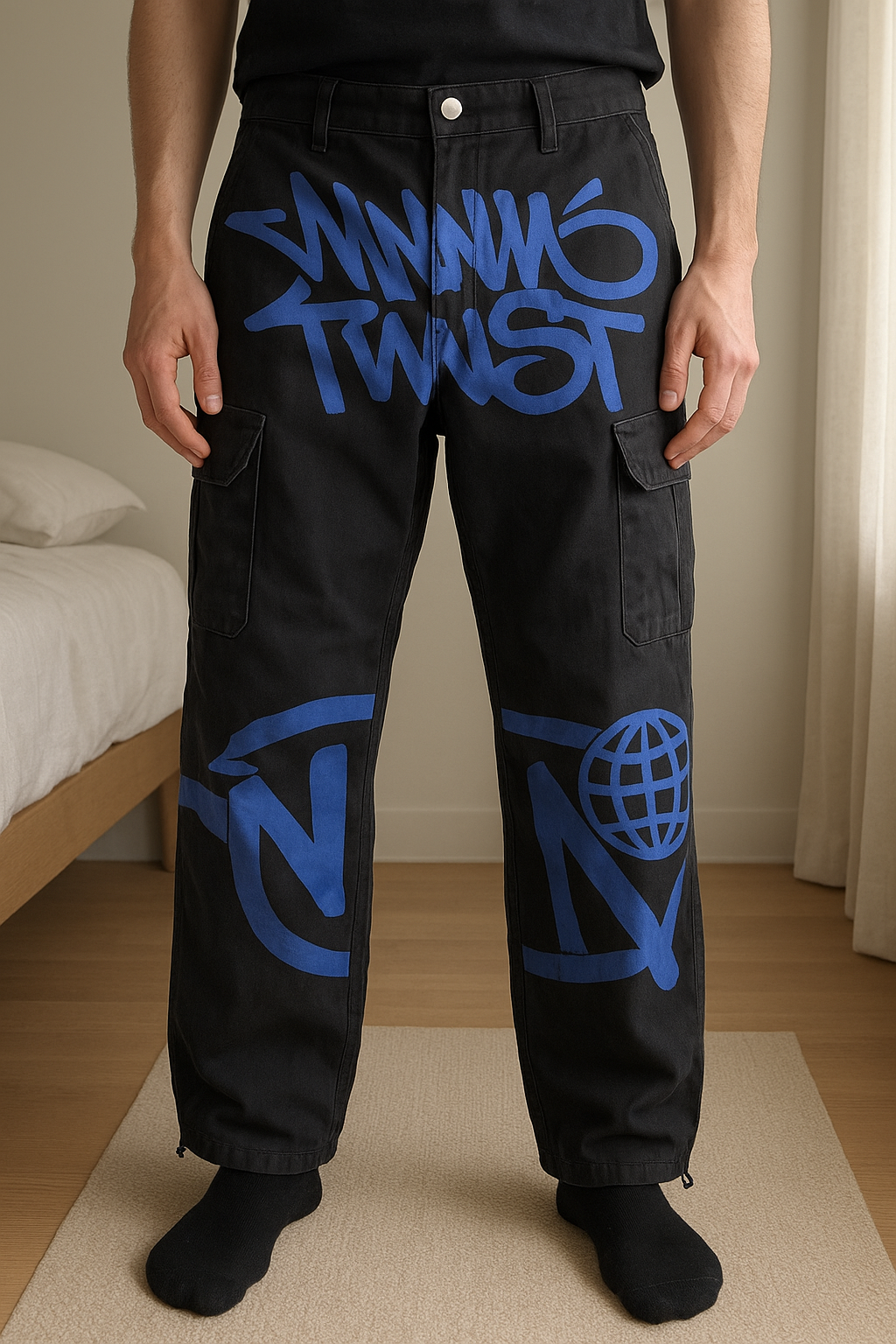 Pantalon cargo Minus two debout, face à la caméra, dans une chambre à la lumière douce, avec une lumière naturelle filtrant par la fenêtre.