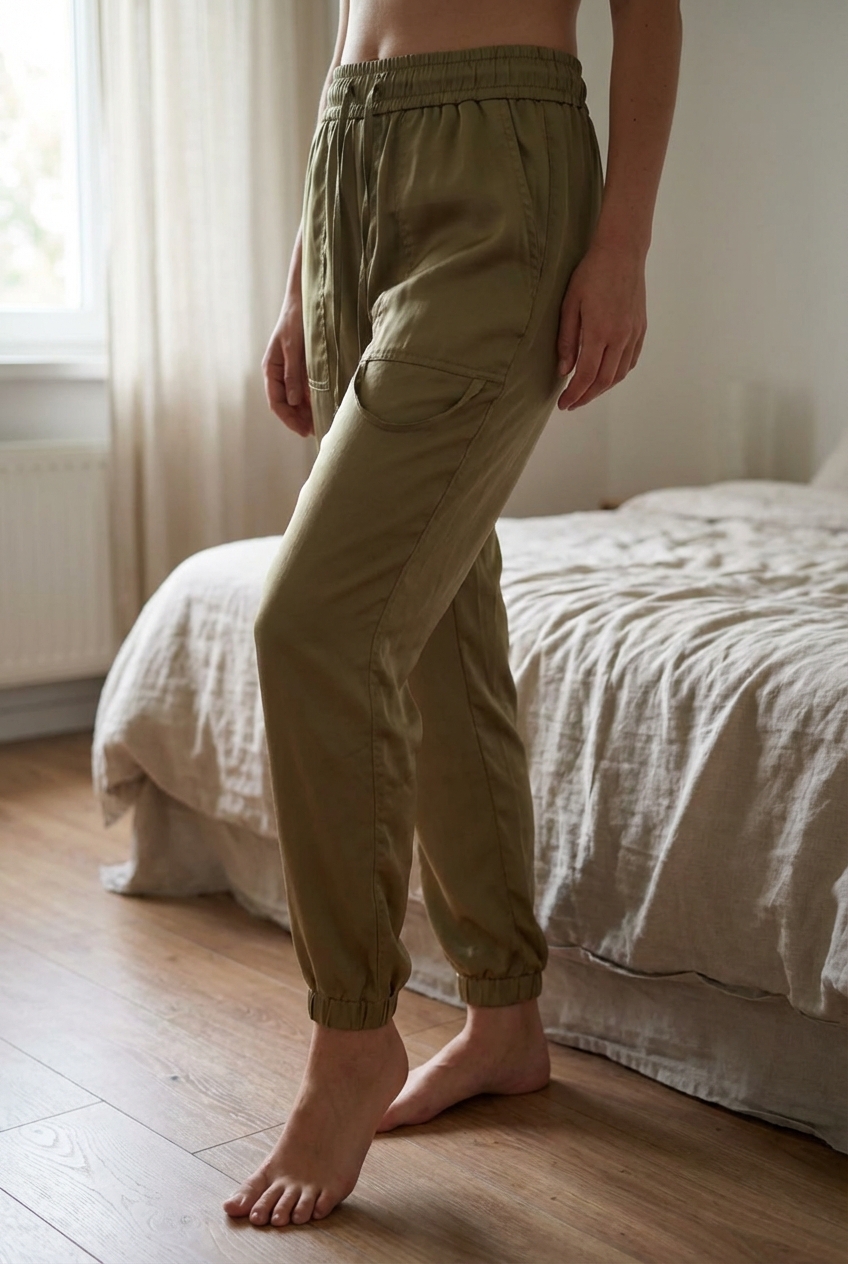 Pantalon cargo satiné fluide vert olive Tally Weijl Taille 36 debout, face à la caméra, dans une chambre à la lumière douce, avec une lumière naturelle filtrant par la fenêtre.