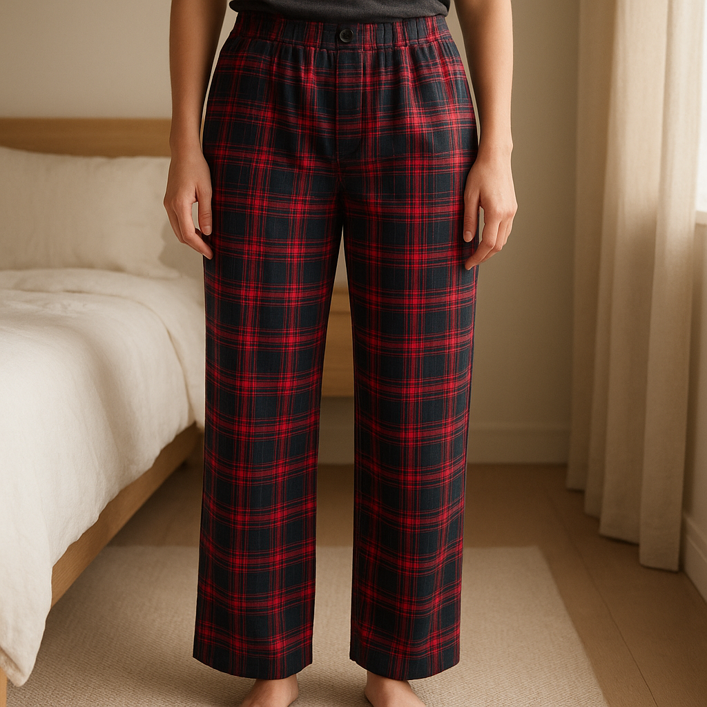 Pantalon carreaux tartan rouge tendance New Look taille 36 debout, face à la caméra, dans une chambre à la lumière douce, avec une lumière naturelle filtrant par la fenêtre.