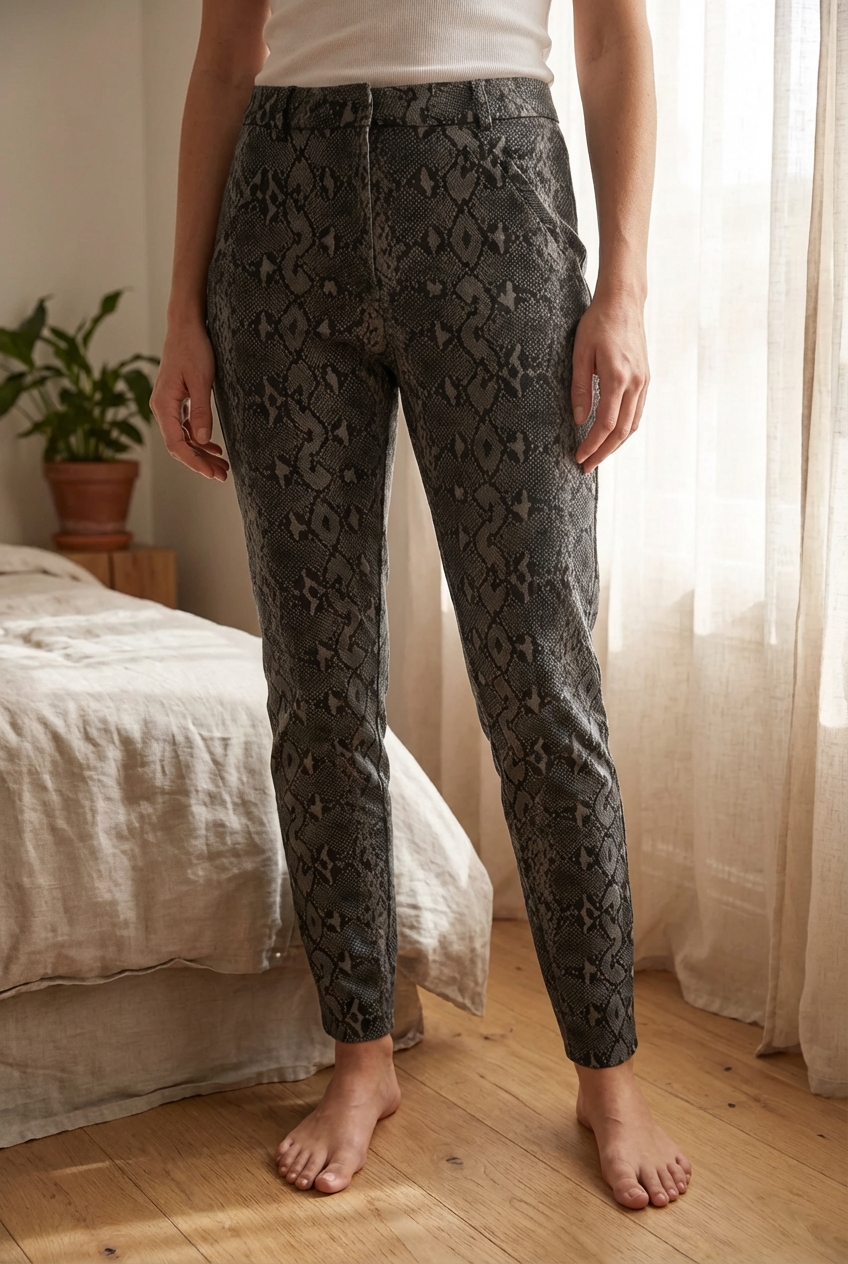 Pantalon femme five units taille 40 debout, face à la caméra, dans une chambre à la lumière douce, avec une lumière naturelle filtrant par la fenêtre.