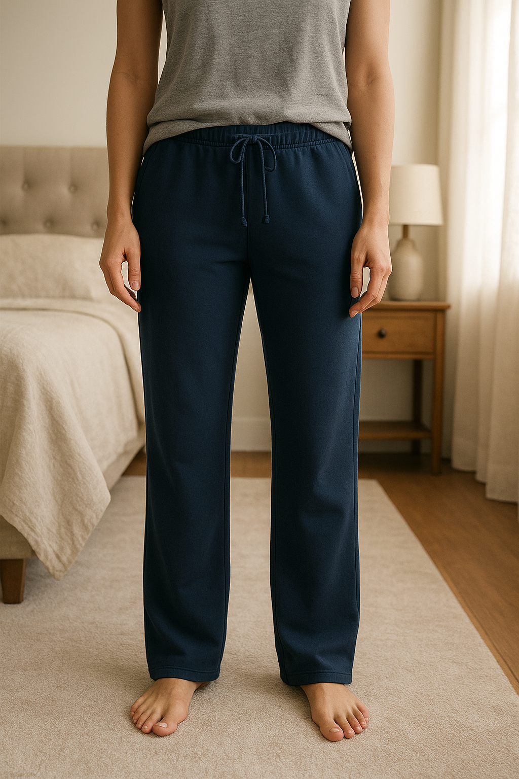 Pantalon jogging HM bleu debout, face à la caméra, dans une chambre à la lumière douce, avec une lumière naturelle filtrant par la fenêtre.