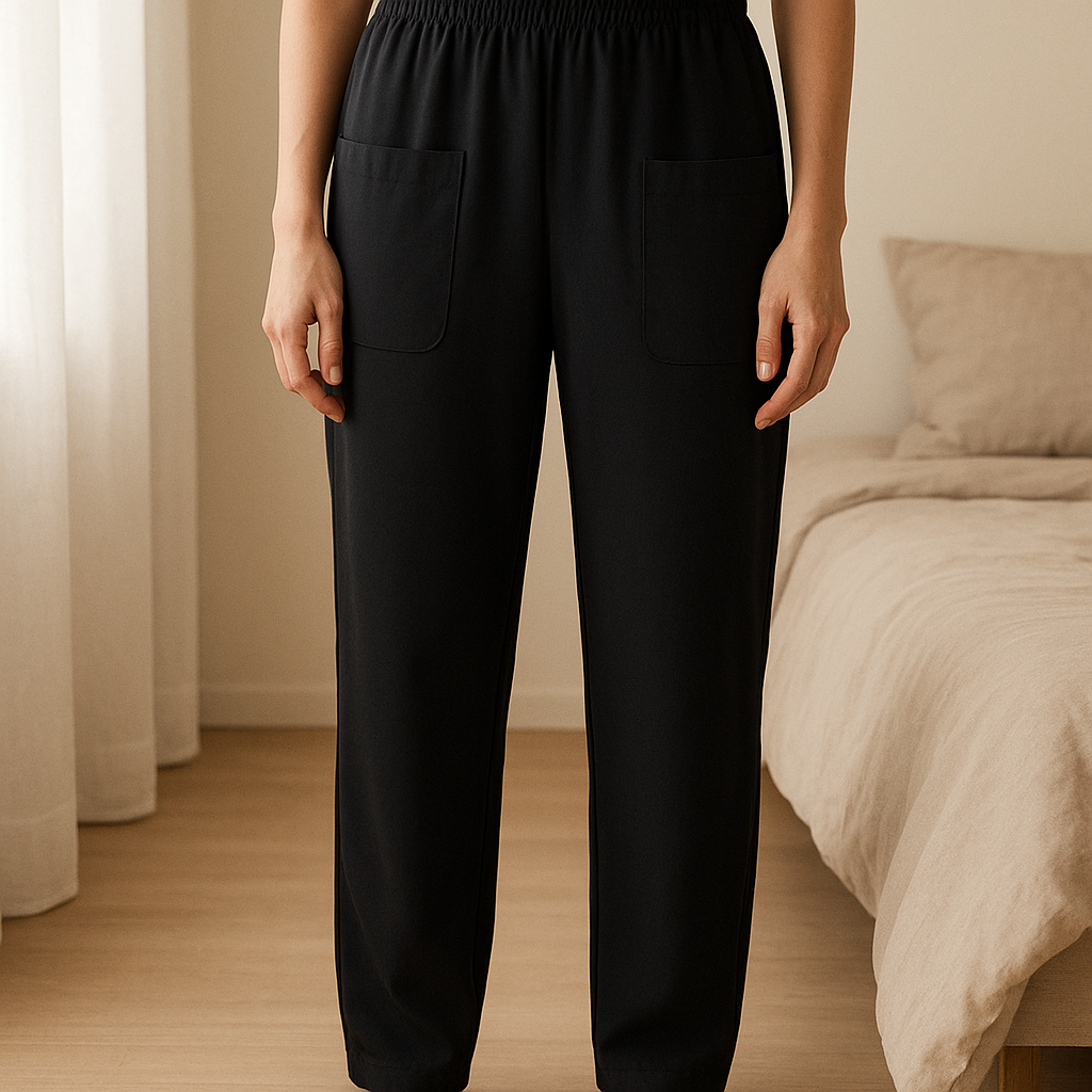 Pantalon noir fluide léger,36 SHEIN très bon état debout, face à la caméra, dans une chambre à la lumière douce, avec une lumière naturelle filtrant par la fenêtre.