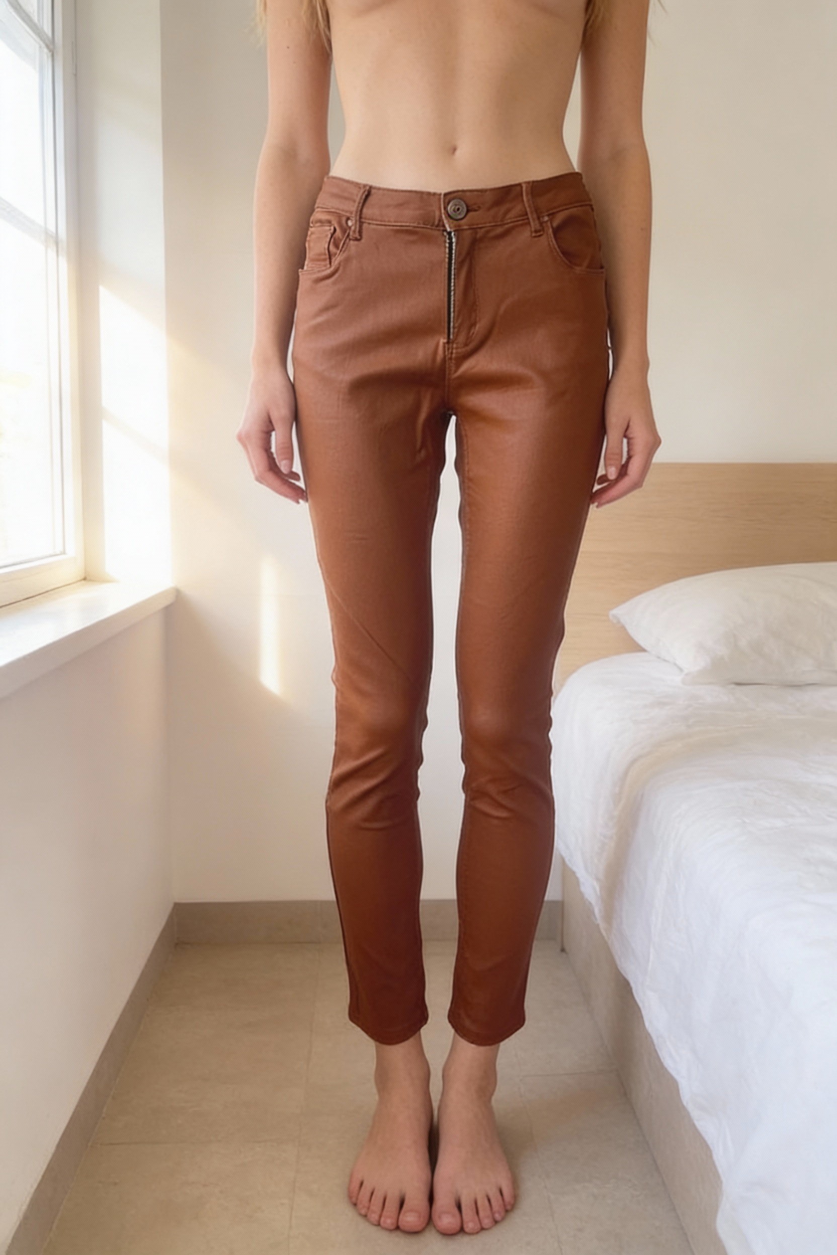 Pantalon simili cuir marron taille XL debout, face à la caméra, dans une chambre à la lumière douce, avec une lumière naturelle filtrant par la fenêtre.