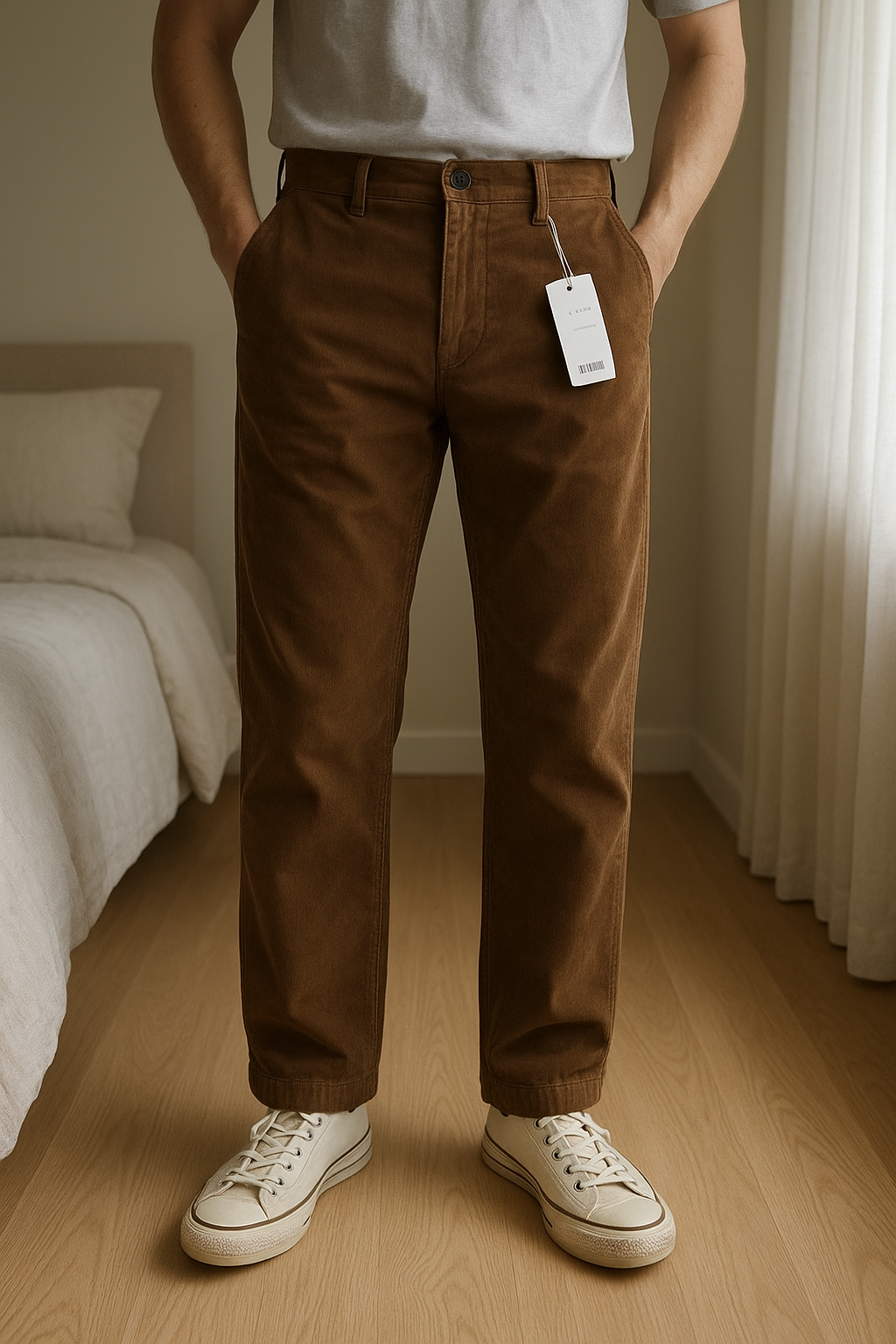 Pantalon Springfield NEUF avec étiquette – Velours côtelé stretch debout, face à la caméra, dans une chambre à la lumière douce, avec une lumière naturelle filtrant par la fenêtre.