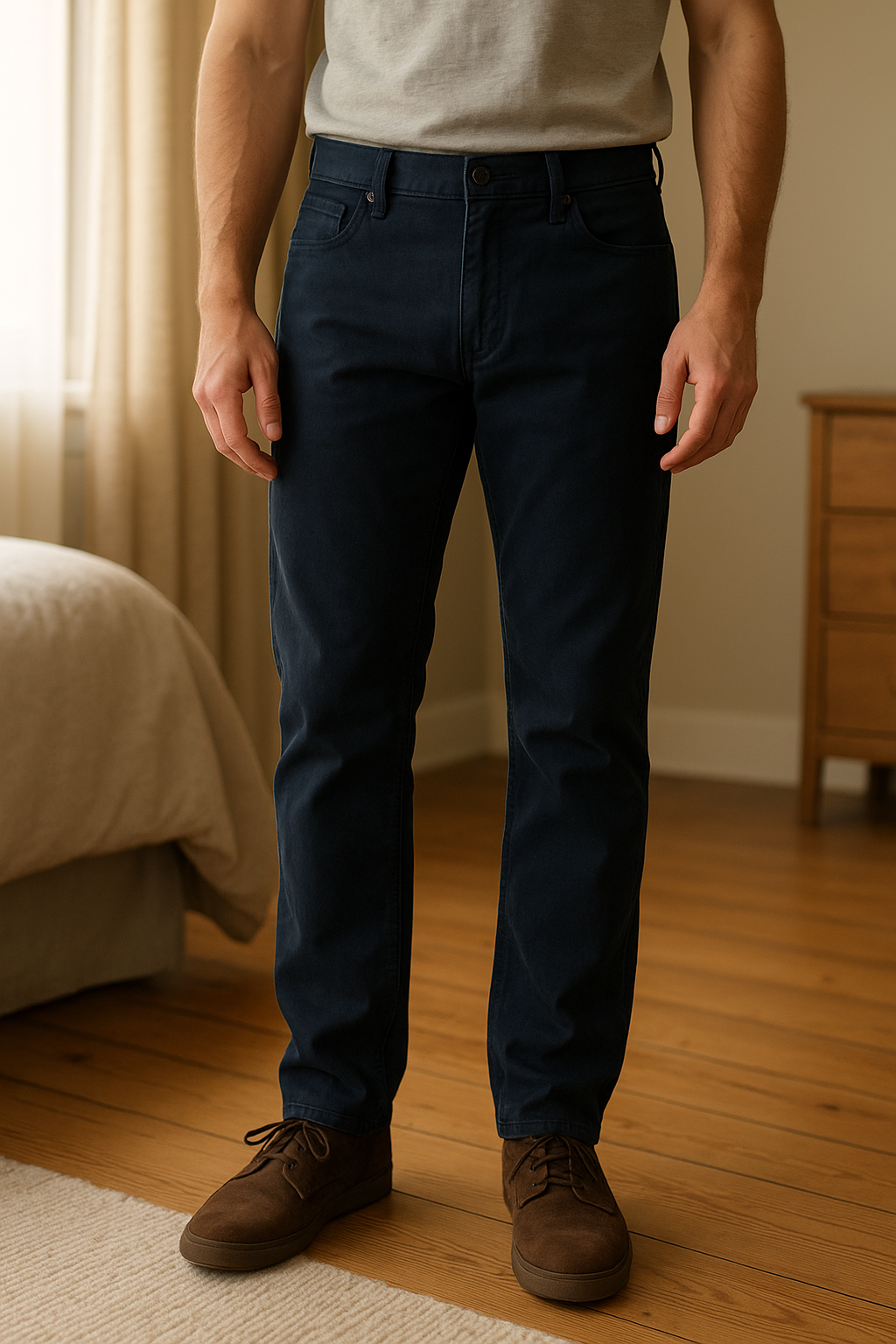 Pantalon Vans 26/12 debout, face à la caméra, dans une chambre à la lumière douce, avec une lumière naturelle filtrant par la fenêtre.