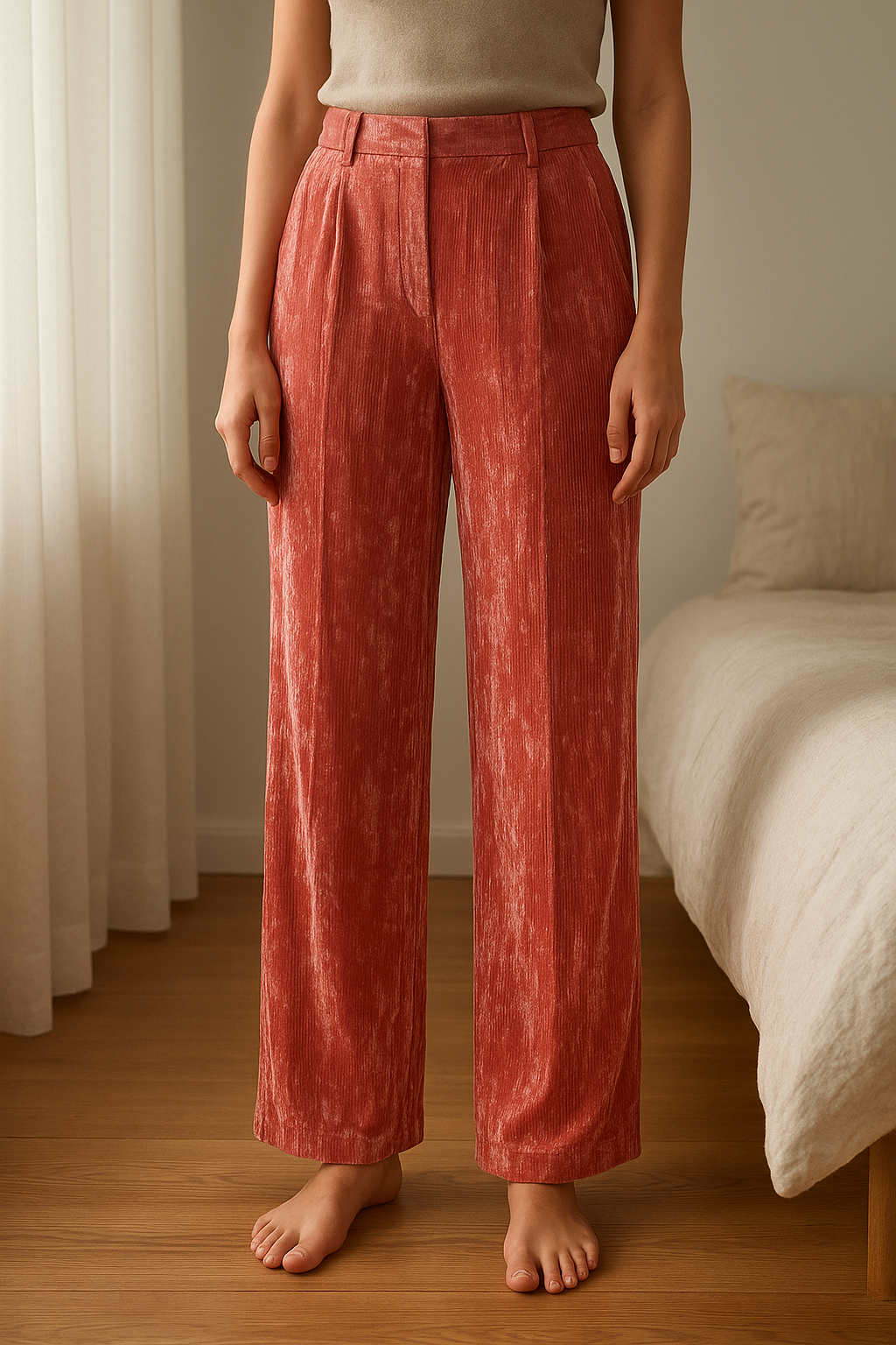 Pantalon velours The Kooples taille 36 debout, face à la caméra, dans une chambre à la lumière douce, avec une lumière naturelle filtrant par la fenêtre.