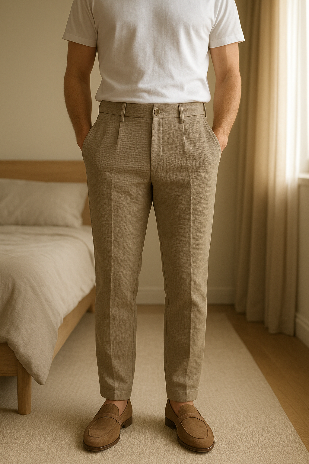 Pantalon Zara en tissu texturé debout, face à la caméra, dans une chambre à la lumière douce, avec une lumière naturelle filtrant par la fenêtre.