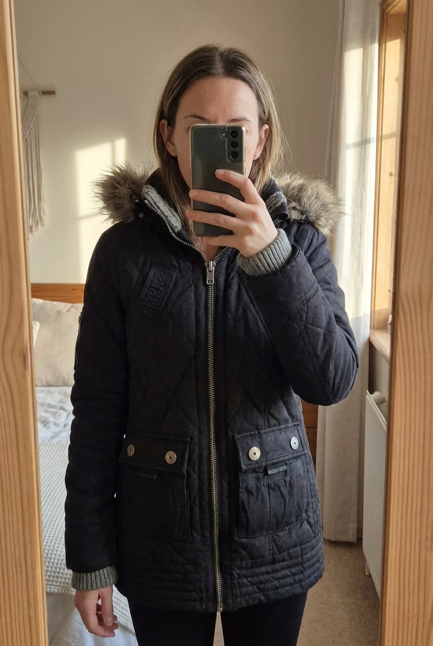 parka femme superdry jpn taille M debout, face à la caméra, dans une chambre à la lumière douce, avec une lumière naturelle filtrant par la fenêtre.