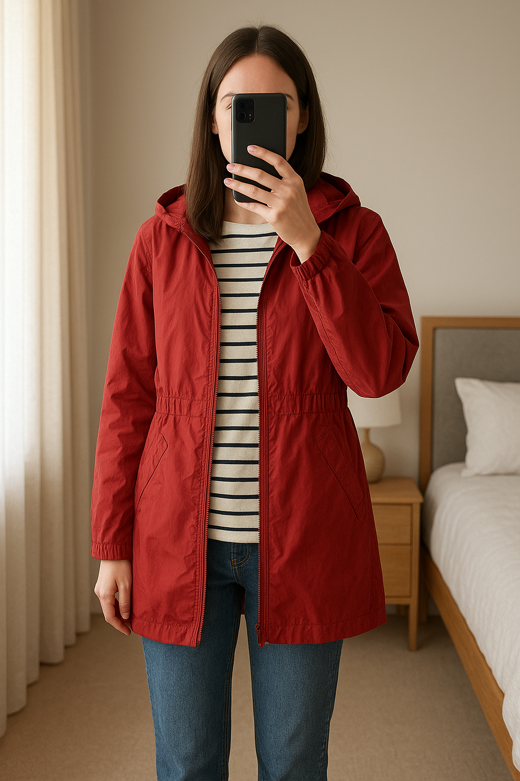 Parkas avec capuche debout, face à la caméra, dans une chambre à la lumière douce, avec une lumière naturelle filtrant par la fenêtre.