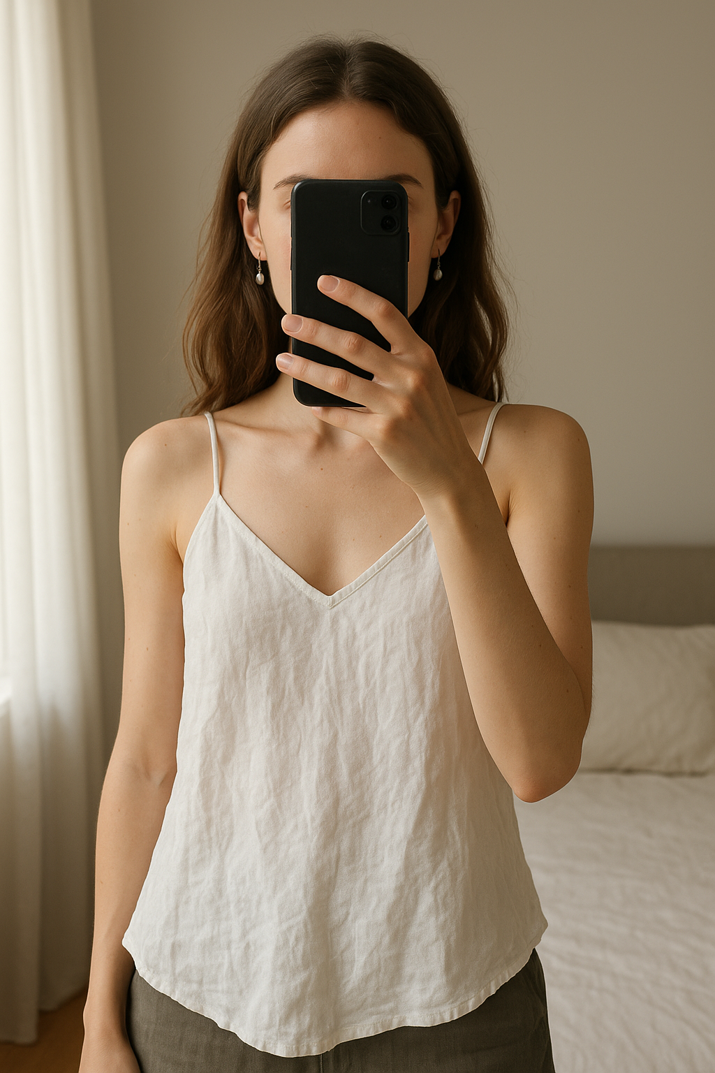petit haut debout, face à la caméra, dans une chambre à la lumière douce, avec une lumière naturelle filtrant par la fenêtre.